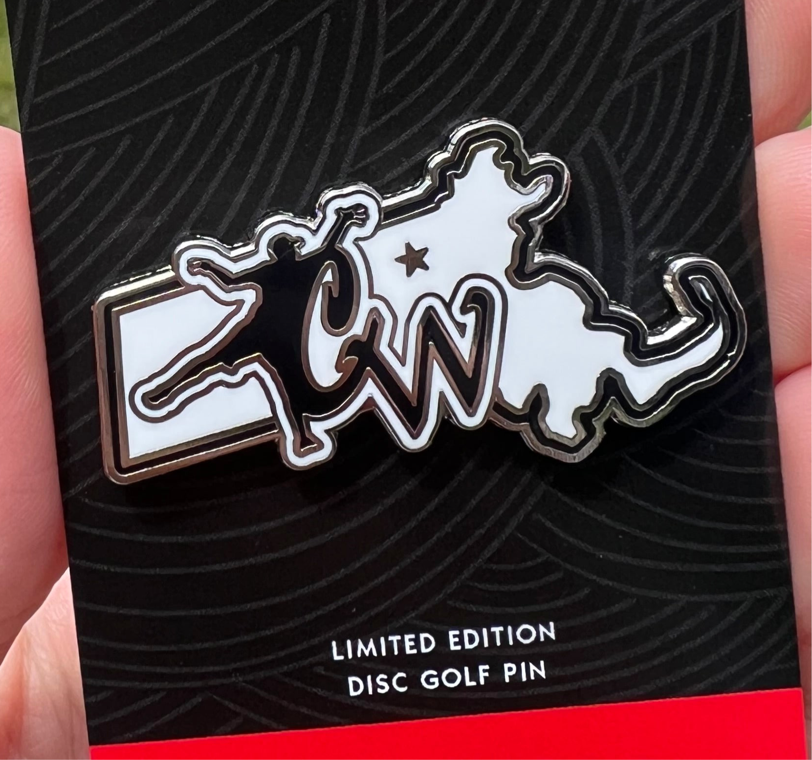 The Casey White Disc Golf Pin uses the state of Massachusetts as a base with Casey White’s logo as the center piece. The Massachusetts native travels the world with his girlfriend and dog to play in the Disc Golf Pro Tour. Pick up one of these pins to support Casey’s tour and check out his amazing YouTube channel.