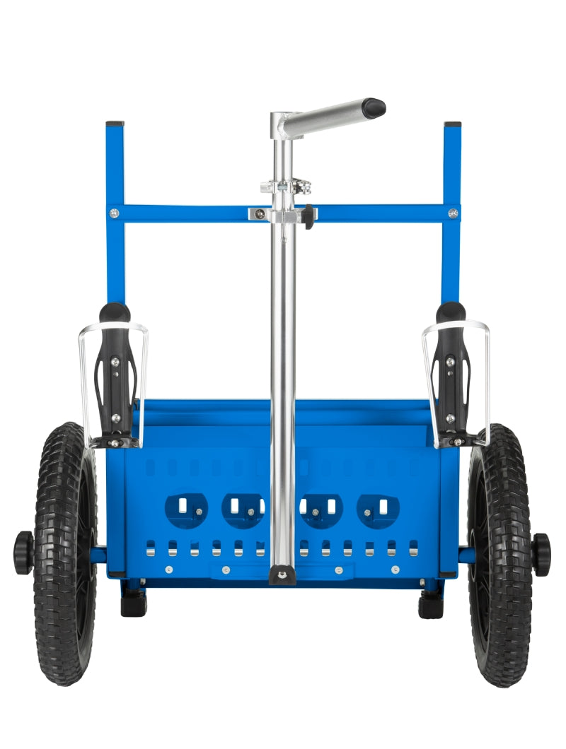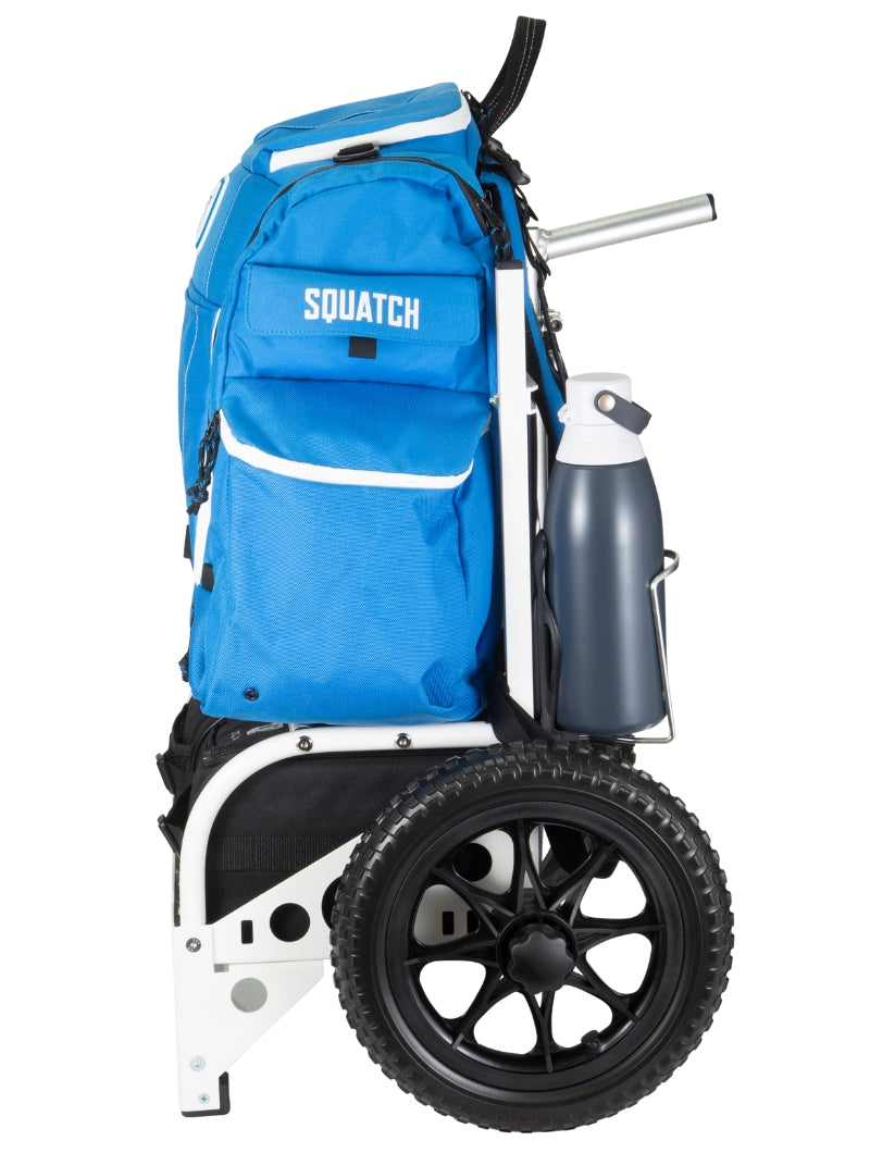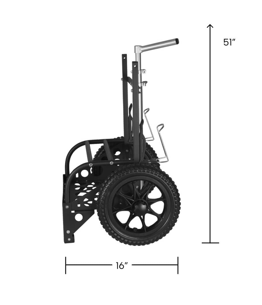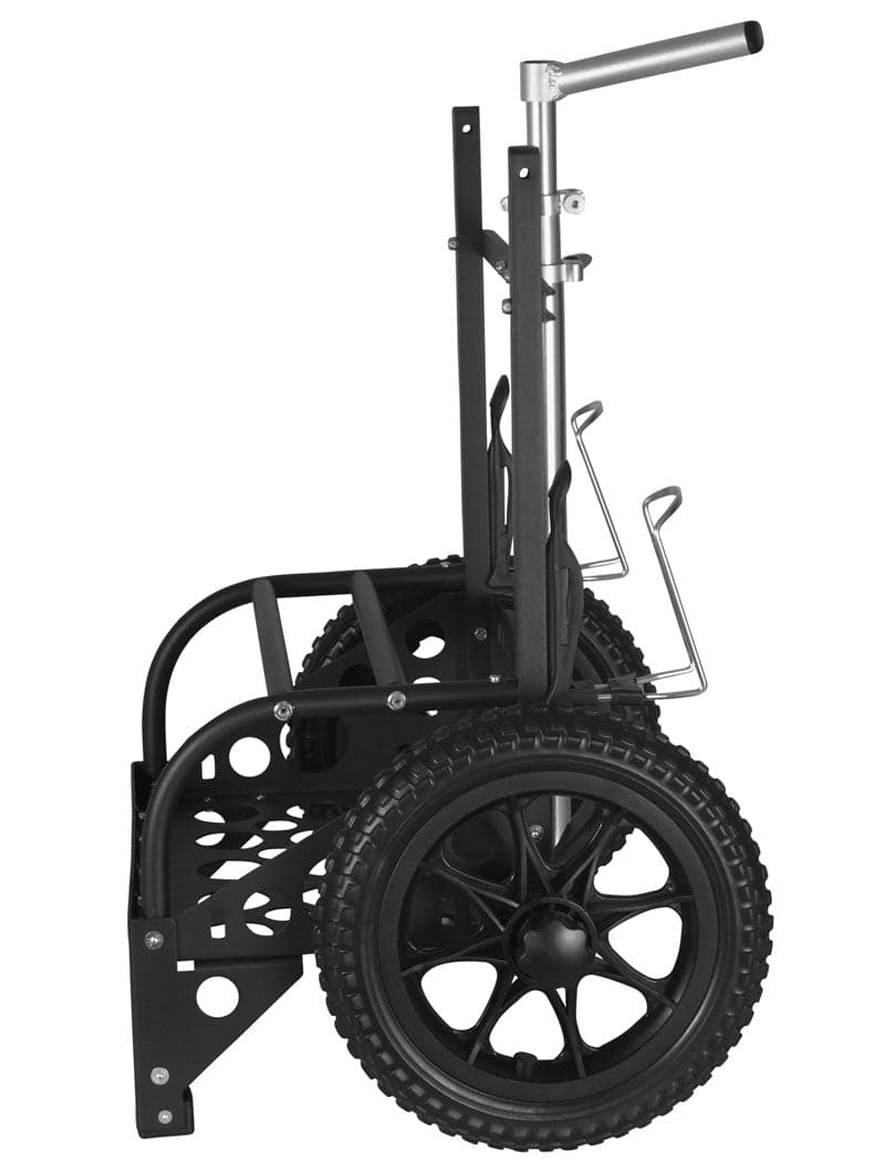 Our open-frame design provides expanded capacity to accommodate even the largest disc golf backpacks. The built-in bag support shelf improves accessibility to all your equipment and creates a separate storage area that provides flexibility to carry a variety of bags and equipment. Turn your favorite bag into a rolling backpack and go anywhere with less effort and stress. Travel with heavy gear on any terrain - from urban to suburban. Holds most disc golf bags with ease - even oversized models. This cart is NOT made to sit on.